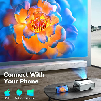 Mini projector is 80% brighter than other mini projectors at the same price. Support 1080P Full HD, 6000:1 contrast ratio, provides an incredibly lifelike image for videos and movies, you may enjoy the happy time with your family or friends at home or outdoor. Meanwhile, the diffuse reflection technology can make the projection image softer and protect your eyes.